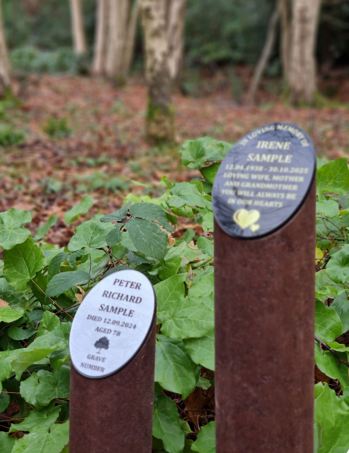 Our woodland memorial posts are available in two sizes, posts are made from recycled materials with a wooden effect finish and have an engraved perspex plaque.